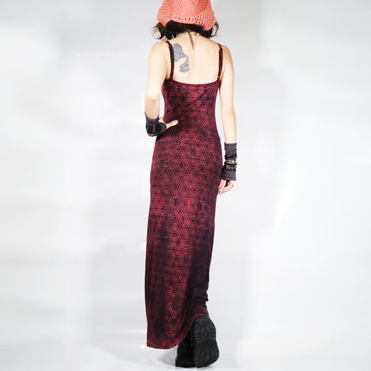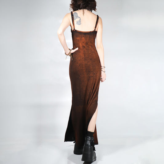 スーパーストレッチ スリット入り ロングキャミワンピース/エスニック柄 × ブラウングラデ
